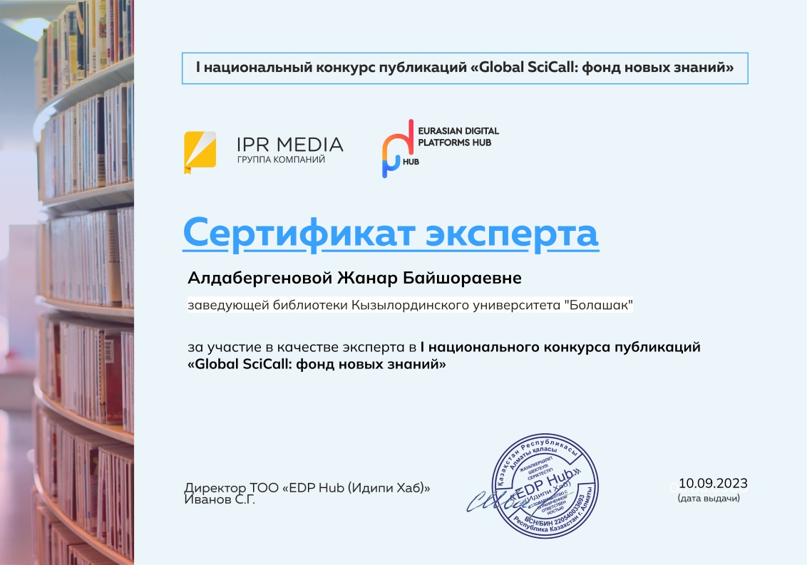 Global SciCall: жаңа білім қорының авторлық жұмыстар ұлттық байқауының сарапшысы ретінде қатысқаны үшін алғыс пен IPR MEDIA компаниясының сараптамалық сертификаты кітапхана меңгерушісі Ж.Б. Алдабергенова табысталды.