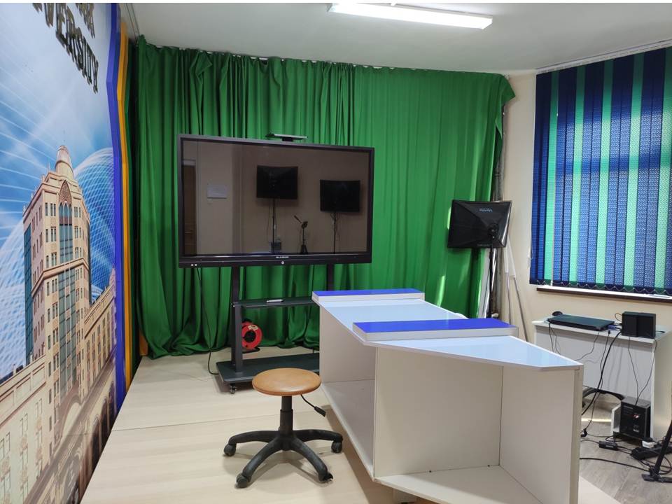 Университет студиясы- оқу-тәжірибелік студия болғандықтан осы жерде монтаж столы да орналасқан. Студияда өз мүмкіншілігіне сай жарық қойылған. Жарықты жинақтаушы құрал да өз функциясын орындап тұр.